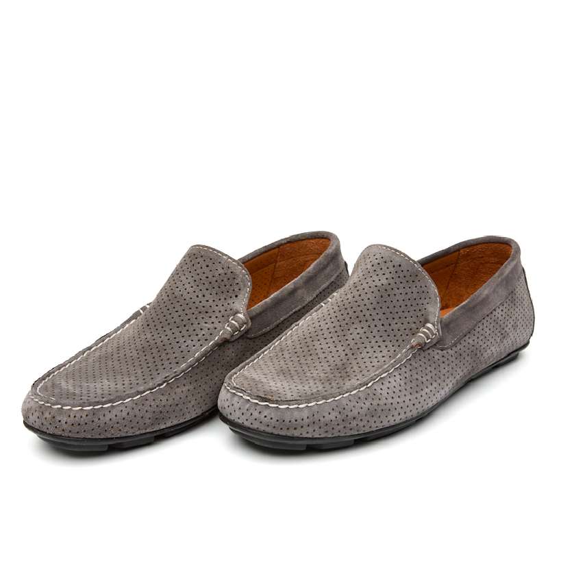 Мужские мокасины с перфорацией. Цвет серый. Мягкая и крепкая турецкая замша хромового дубления, удобная колодка. Лёгкие - 250 грамм. Для любых стоп, кроме самых узких. Подошва и интегрированный каблук из современного эластомера не скользят, позволяют хорошо чувствовать педали и амортизируют при ходьбе.