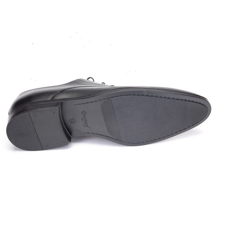 Классические мужские цельнокроеные туфли на шнурках, цвет черный-матовый, полуботинки Бонти для нормальных и широких стоп с любым подьёмом, кроме очень высокого. Сочетаются почти со всеми брюками - и с костюмной классикой и с джинсами. Из красивой и прочной натуральной глянцевой кожи высшего качества. Удобно фиксируют ногу. 4 ряда люверсов обеспечивают подгонку по подъёму. Новые подошва и каблук высотой 25 мм из сшитого полиуретана амортизируют при ударах и выделяются стойкостью к износу.